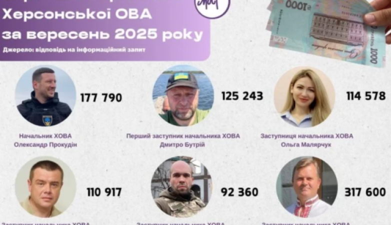 За вересень 2025 року начальник Херсонської обласної військової адміністрації Олександр Прокудін та його заступники сумарно заробили понад 970 тисяч гривень.