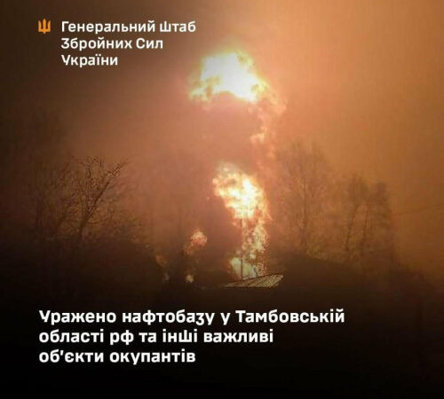 Зокрема, було уражено нафтобазу «Дмітрієвська» у Тамбовській області РФ, яка використовується для потреб російського війська. Після удару зафіксовано пожежу — попередньо горять декілька резервуарів із нафтопродуктами. Наслідки влучань уточнюються. Про це повідомили у Генштабі ЗСУ.
